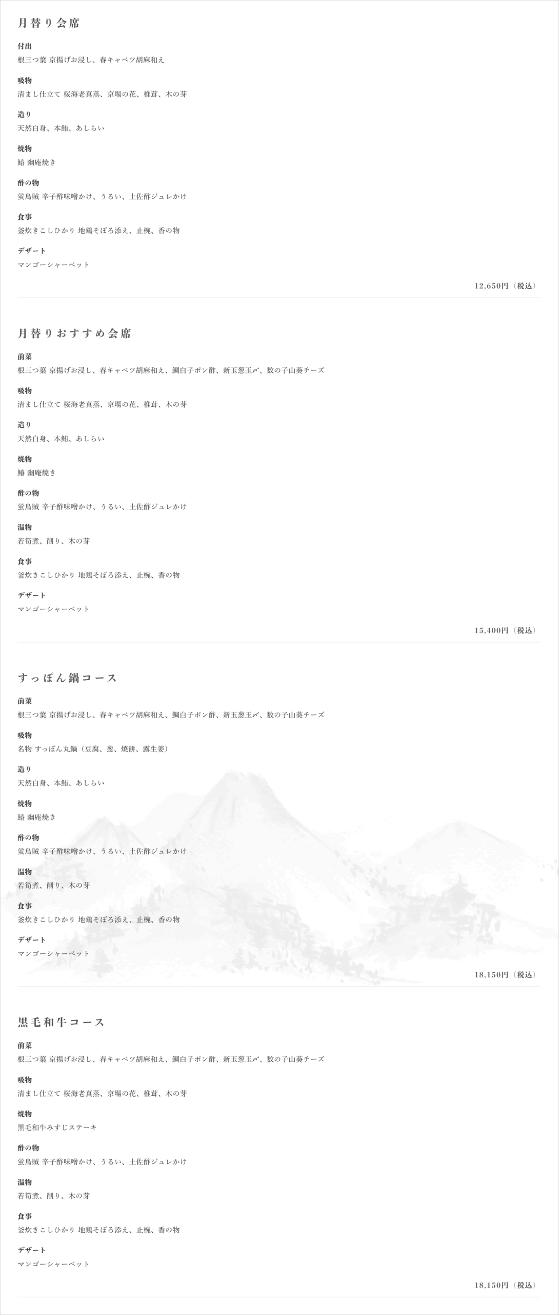 割烹さいお > 新着情報 > 4月のメニューはこちら 4月のメニューはこちら 2026.03.26 割烹さいおの4月のコースを更新いたしました。 詳しくは以下のURLよりご確認下さい。 https://kappou-saio.com/food/ ※ホームページ上のメニュー表は毎月更新されます。 皆様のご来店心よりお待ちしております。 << 前の記事へ Recent Posts 4月のメニューはこちら 2026年3月26日 3月のメニューはこちら 2026年2月24日 2月のメニューはこちら 2026年1月26日 1月のメニューはこちら 2025年12月26日 12月のメニューはこちら 2025年11月25日 Archives Archives Select Month 2026年3月 (1) 2026年2月 (1) 2026年1月 (1) 2025年12月 (1) 2025年11月 (1) 2025年10月 (1) 2025年9月 (1) 2025年8月 (1) 2025年7月 (1) 2025年6月 (1) 2025年5月 (1) 2025年4月 (1) 2025年3月 (1) 2025年2月 (2) 2025年1月 (1) 2024年12月 (1) 2024年11月 (1) 2024年10月 (1) 2024年9月 (1) 2024年8月 (1) 2024年7月 (1) 2024年6月 (1) 2024年5月 (1) 2024年3月 (2) 2024年2月 (1) 2024年1月 (1) 2023年12月 (1) 2023年11月 (1) 2023年10月 (1) 2023年9月 (1) 2023年8月 (1) 2023年7月 (1) 2023年6月 (1) 2023年5月 (1) 2023年4月 (1) 2023年3月 (1) 2023年2月 (1) 2023年1月 (1) 2022年12月 (1) 2022年11月 (1) 2022年10月 (2) 2022年8月 (2) 2022年6月 (1) 2022年5月 (1) 2022年4月 (3) 2022年3月 (1) 2022年2月 (1) 2021年12月 (2) 2021年11月 (1) 2021年9月 (2) 2021年8月 (1) 2021年6月 (1) 2021年5月 (1) 2021年4月 (1) 2021年3月 (1) 2021年2月 (2) 2021年1月 (1) 2020年11月 (1) 2020年10月 (1) 2020年9月 (2) 2020年7月 (1) 2020年6月 (1) 2020年5月 (1) 2020年4月 (1) 2020年3月 (1) 2020年2月 (1) 2020年1月 (1) 2019年12月 (2) 2019年11月 (1) 2019年10月 (1) 2019年9月 (1) 2019年8月 (1) 2019年7月 (2) 2019年6月 (1) 2019年5月 (1) 2018年12月 (1)